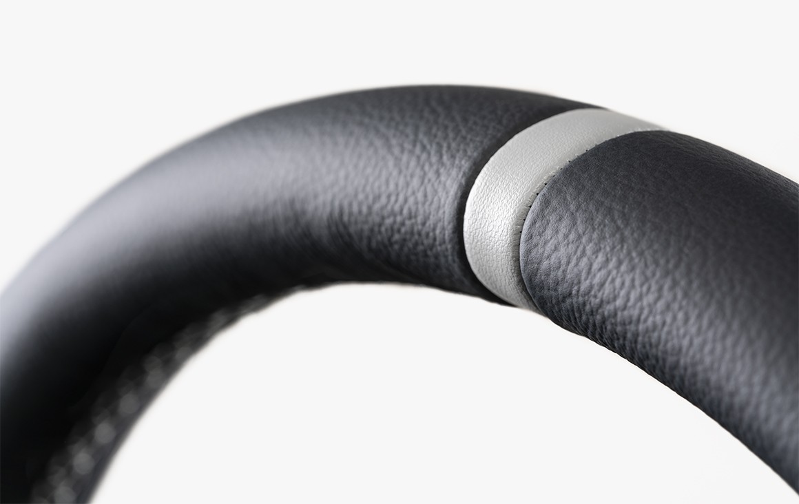 The rim is made in brushed and anodised aluminium and covered in genuine smooth leather. It features a light grey centre stripe and light grey cross stitching.