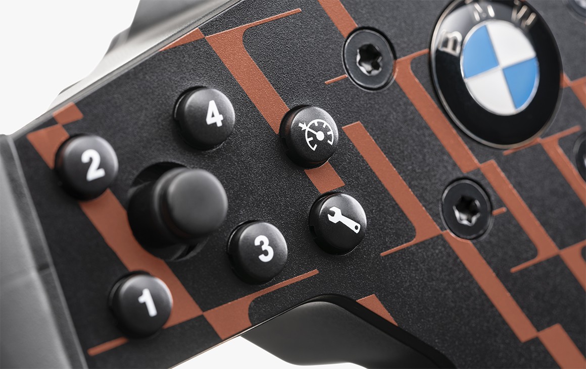 A unique BMW-designed graphic stretches across the front face and rim. The 300 mm diameter is suitable for many vehicle types, and the lightweight construction retains fine force feedback detail even at low torque settings.
