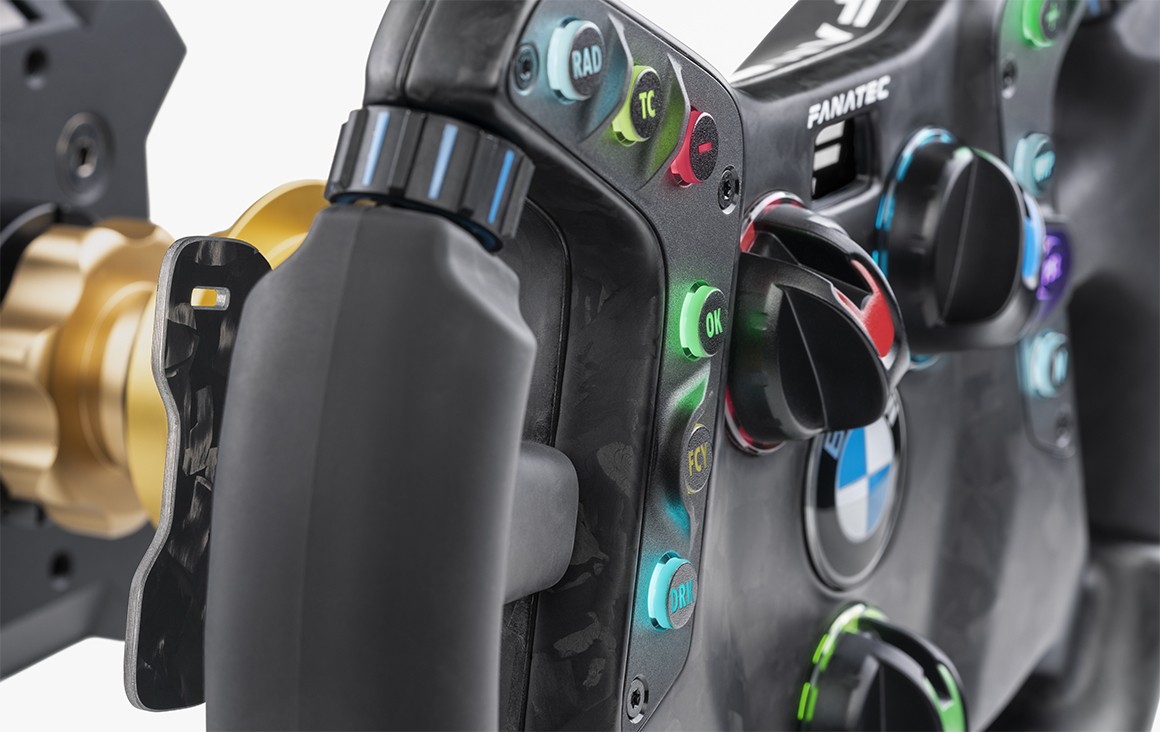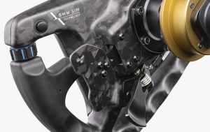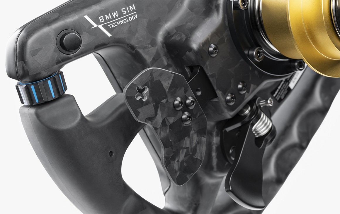 The M4 GT3 wheel is covered in features, some of which are not obvious at a glance, such as dual-action magnetic shifters, dual-analogue clutch paddles with adjustable travel, two extra rear-mounted buttons, and the D-pad hidden under the BMW logo.
