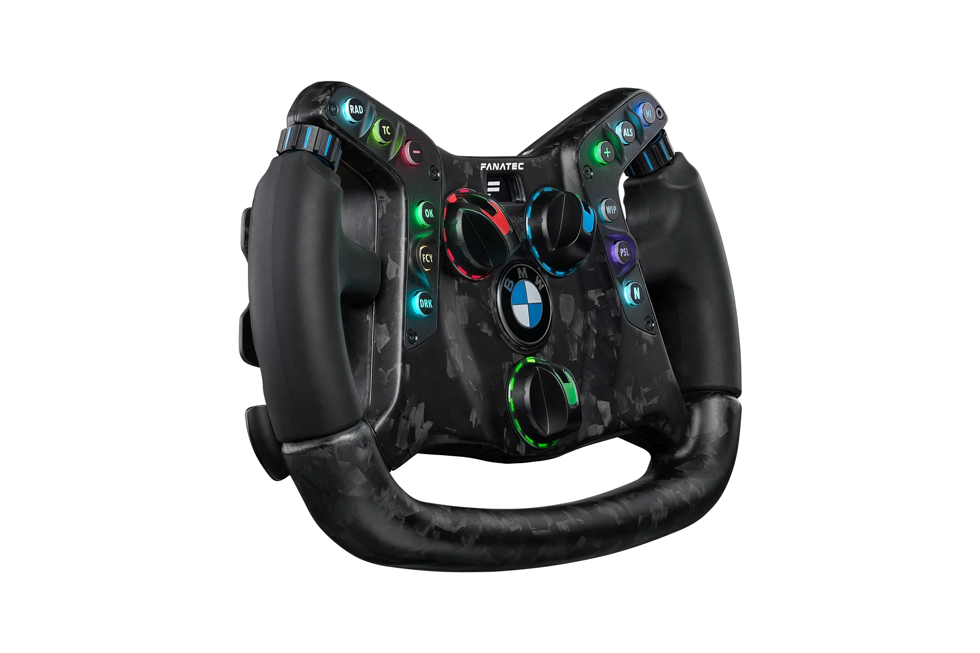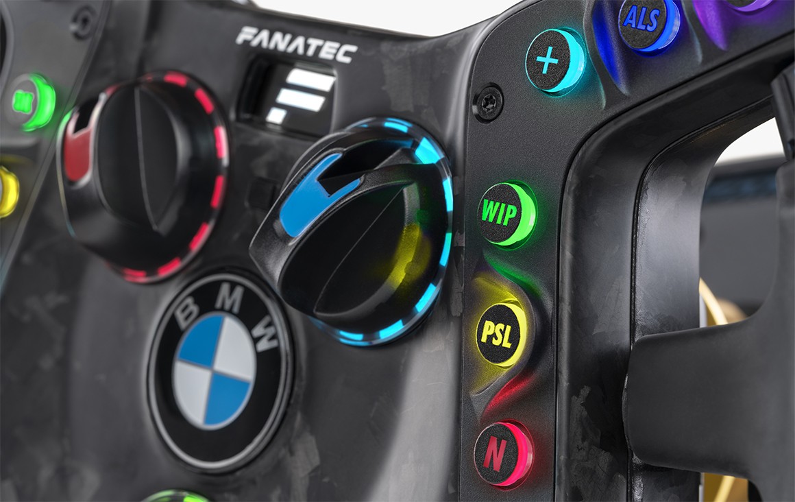 The RGB LEDs behind all 12 front-facing buttons plus backlit multi-position switches means you’ll always find the right input in the heat of competition. Programmable via CAN bus in the real car, and via FanaLab on your PC, the backlit buttons can even function as RevLEDs or tyre slip indicators.