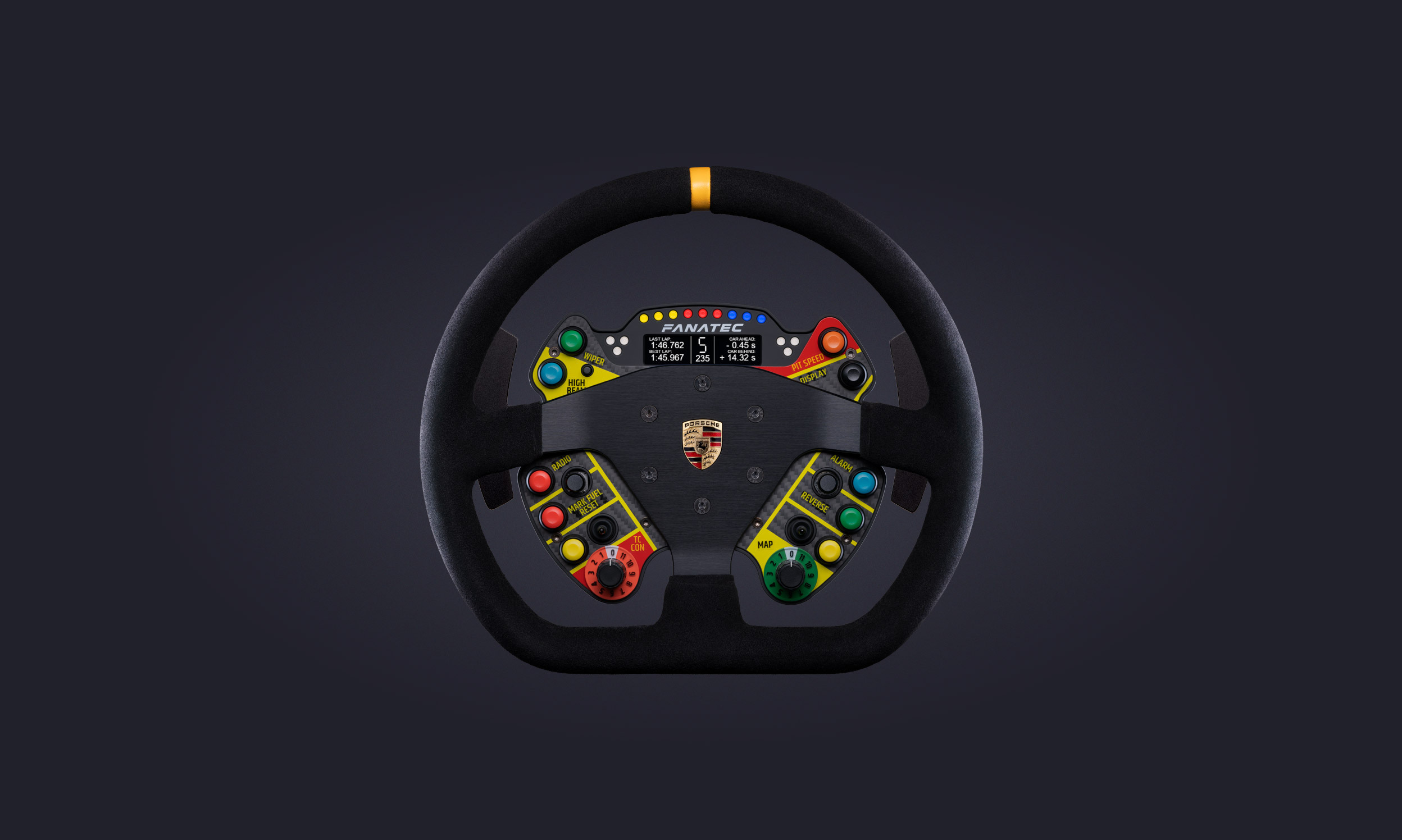 The Porsche 911 GT3 Cup rim is a premium quality replica of the real Porsche steering wheel based on original CAD data, built to automotive-grade quality. The brushed and anodised aluminium rim is covered in genuine, premium SUADE leather.