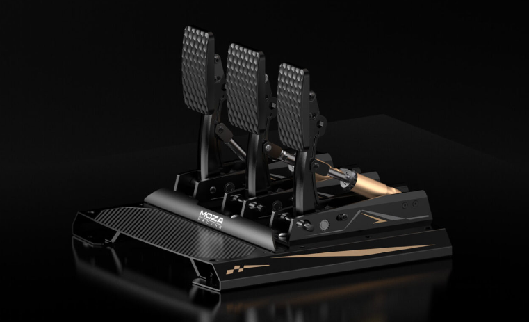 The sim racing pedal features a minimalist design with smooth curves and a sophisticated black and gold color scheme, exuding competitive energy. The hexagonal design elements on the pedal face symbolize stability, balance, and versatility. Cleverly concealed wiring, springs, and pedal screws ensure a clean and aesthetically pleasing appearance.