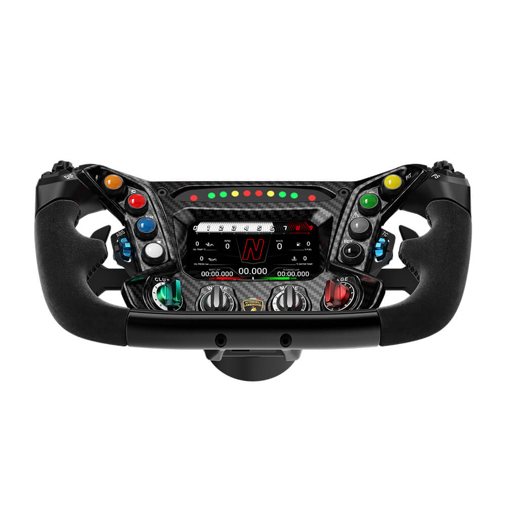 This steering wheel features ten high-brightness LEDs capable of displaying 16.7 million colors. Eight central RevLEDs offer clear shift indicators, while two customizable RGB flag indicator LEDs on each side signal flags or vehicle status, enhancing both functionality and aesthetics.