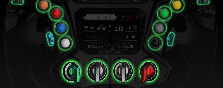 Engineered for optimal usability, this wheel offers an ergonomic layout with 72 programmable inputs, including eight round buttons, four thumb knobs, and four 12-position rotary knobs for effortless adjustments of brake bias, traction control, ABS and more. The CNC anodized aluminium knob caps ensure durability and add a premium touch.