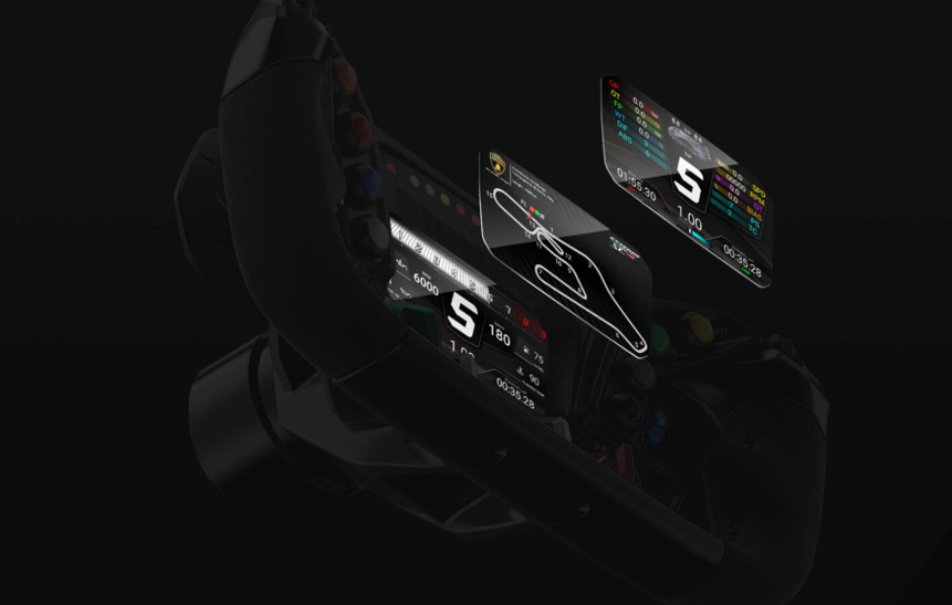 The built-in 4.3-inch touchscreen display enhances your experience with real-time telemetry data and a selection of official Automobili Lamborghini Squadra Corse Ul options, providing an interactive and immersive interface.