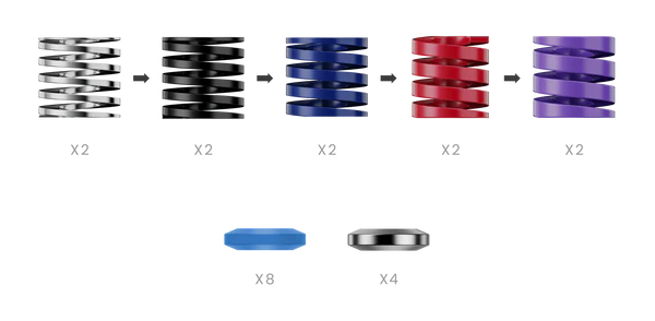 The Performance Kit includes 10 springs, various damping blocks, and a metal block. Combined with the original damping blocks, it offers 1,764 possible pedal feel configurations, simulating the hard brake feel of top-tier race cars like F1 and F2, with nearly zero brake force response time.